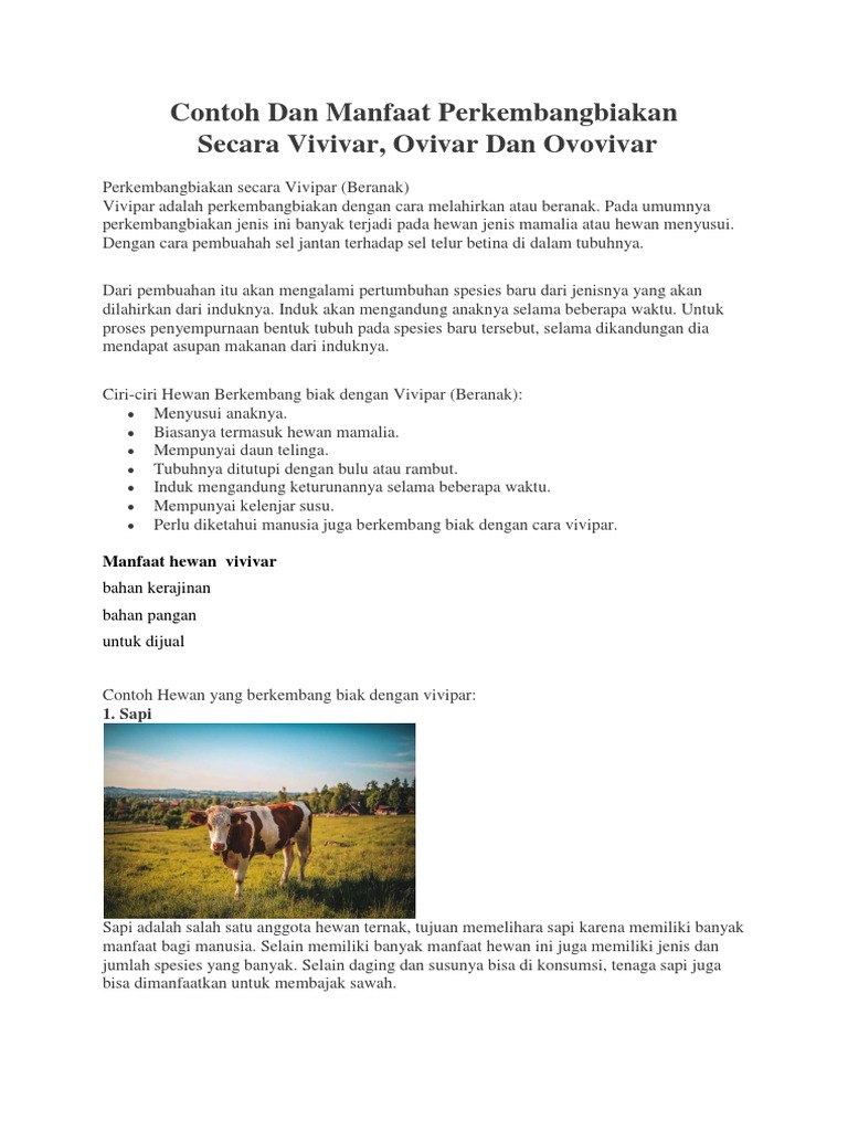 Pengertian hewan vivipar, ciri, contoh dan penjelasan : Contoh hewan ovipar berikutnya adalah buaya. Embrio ini berkembang di dalam tubuh iduknya dan memperoeh makanan dari tubuh induknya melalui plasenta. Embrio hewan ini berkembang didalam telur dengan memanfaatkan cadangan makanan yang ada di dalam telur, sedangkan telur berada di luar tubuh induknya. Semua mamalia berkembang biak dengan cara vivipar atau melahirkan kecuali ekidna yang ovipar dan platypus yang ovovivipar. Embrio meninggalkan tubuh ibu pada akhir kehamilan, melalui jalan lahir. Ovivipar, yaitu perkembanganbiakan dengan cara bertelur. Kelinci merupakan mamalia herbivora atau mamalia pemakan tumbuhan (rumput, buah, sayuran). Sapi adalah hewan vivipar yang termasuk dalam anggota hewan ternak dari suku bovidae. Hewan vivipar (melahirkan) adalah hewan dengan cara melahirkan ditandai dengan pembuahan sel jantan terhadap sel telur betina di dalam tubuh induknya, kemudian mengalami pertumbuhan hingga akhirnya dilahirkan dalam bentuk individu baru yang sejenis, proses ini biasa disebut. Embrio berkembang dan matang di lingkungan luar. Contoh hewan ovivipar adalah ikan, reptil, amfibi, dan. Ada beberapa ciri hewan vivipar yang penting diketahui, lo.